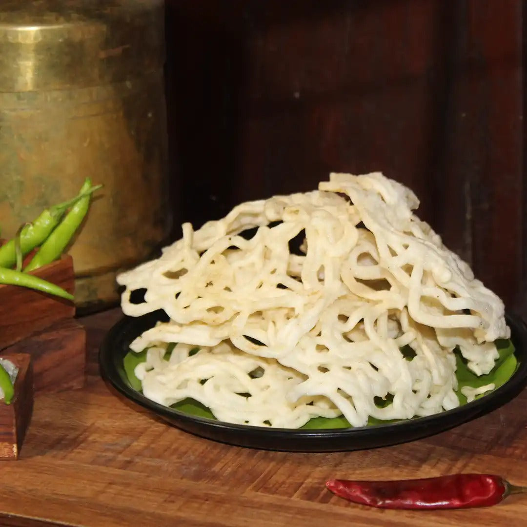 Omapodi Vadam is a traditional South Indian specialty known for its distinctive taste and texture. Made from rice flour, sago, and aromatic ajwain (omam), this vadam is carefully sun-dried to preserve its authentic homemade flavor. Once deep-fried, it turns crispy and golden, making it a delightful accompaniment to rice varieties like sambar rice, curd rice, or rasam rice.